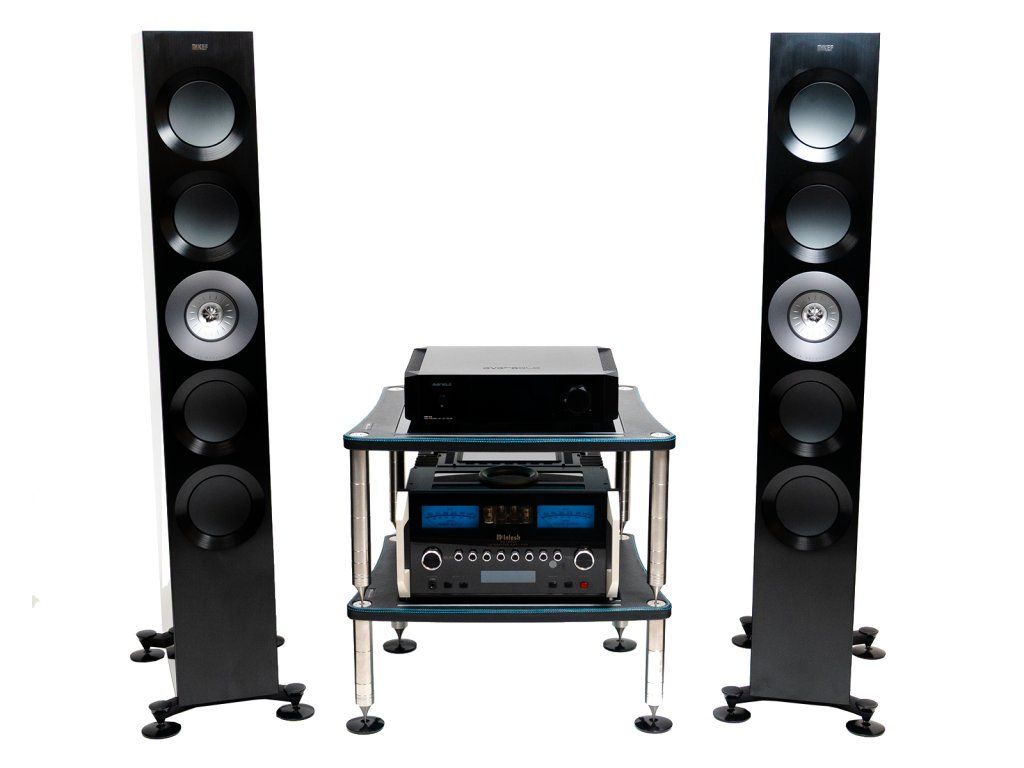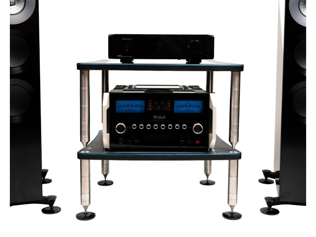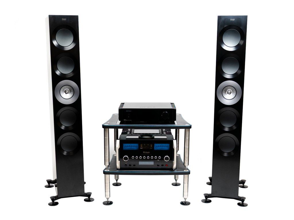 Ikonický McIntosh s modrými VU metry a vrcholové KEF podlahovky klasické řady v sestavě, která se pořizuje jednou na celý život.