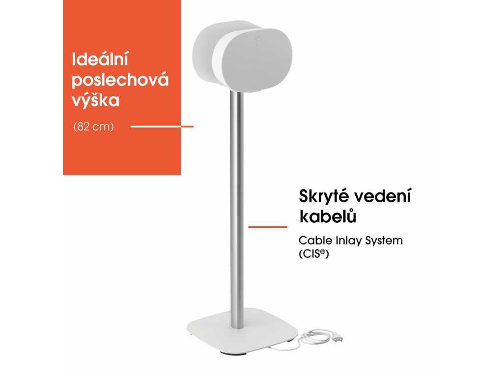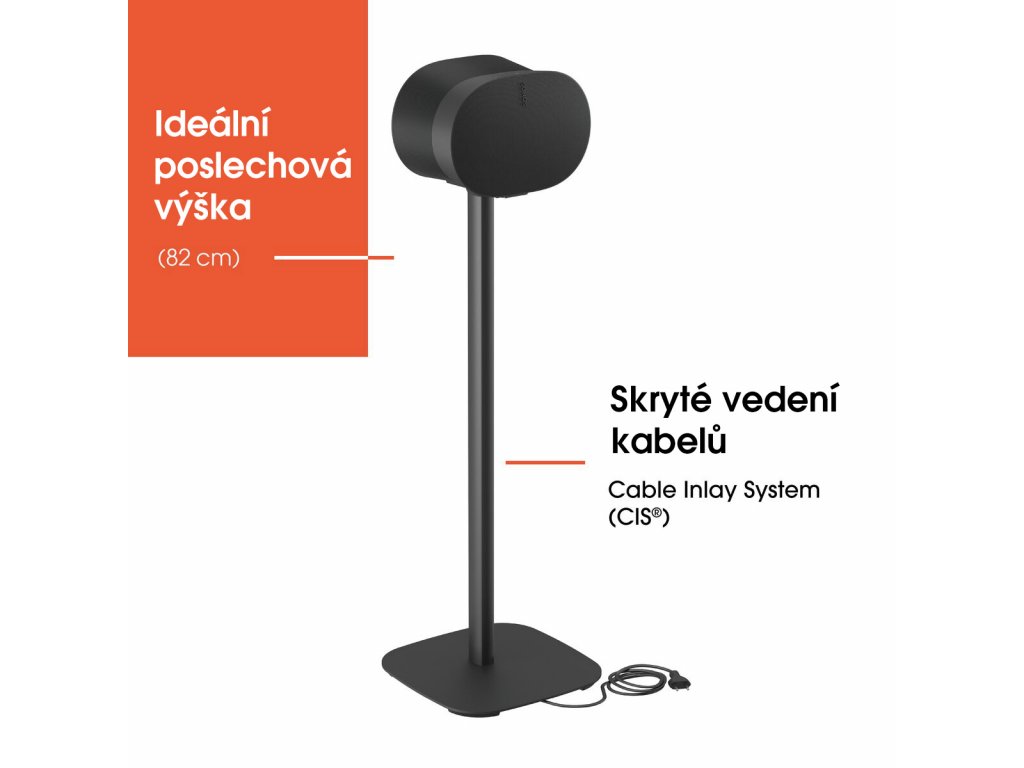 Stojan SFS 4133 má robustní základnu a rozhraní speciálně navržené pro zařízení Sonos Era 300. Stojan byl akusticky testován, abyste měli jistotu, že získáte ten nejlepší možný zvuk. Konstrukce je vybavena systémem CIS® (Cable Inlay System), který umožňuje průchod kabeláže sloupkem, takže není vidět.